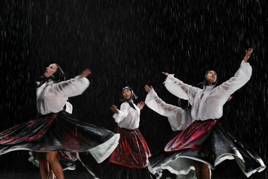 Los intérpretes se mueven en escena como si obedecieran a fuerzas antiguas. Sus cuerpos, iluminados con precisión casi quirúrgica, habitan un espacio escueto que funciona como santuario y como campo de batalla. Cada movimiento tiene algo de plegaria y algo de desafío; cada imagen funciona como un misterio que se resiste a ser explicado. La música de raíz balcánica, áspera y magnética, acompaña el viaje como un latido mineral que no afloja.