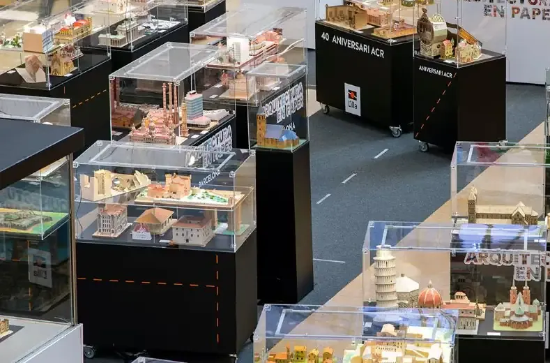 El recorrido de la muestra se organiza en cuatro bloques temáticos: edificios singulares de Barcelona, de Cataluña, del resto del mundo y una selección especial dedicada al 40.º aniversario de la Associació Catalana d’Amics del Retallable. Entre las piezas destacan versiones en miniatura de iconos como el Parlamento de Budapest, el Park Güell, la Sagrada Família, el Duomo de Florencia o el Monasterio de Sant Pere de Rodes.