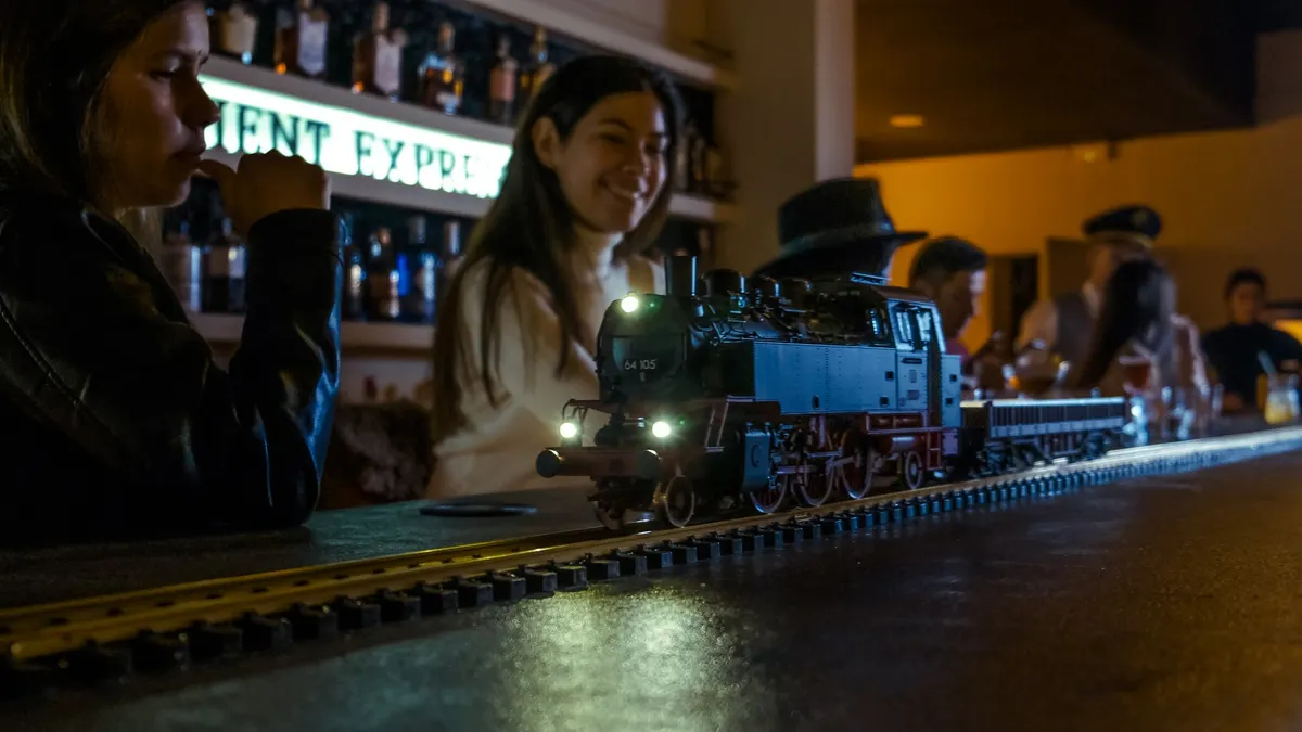 Estos trenecitos, que serpentean entre las mesas sobre vías cuidadosamente dispuestas, reflejan la ingeniería y el lujo del Orient Express original. Cada tren está diseñado para transportar y servir los cócteles con estilo, haciendo que cada entrega sea una parte integral de la experiencia mágica del bar.