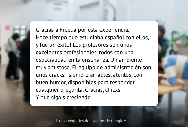 «Freeda» está acreditada por el Instituto Cervantes y FEDELE, y es centro examinador oficial de los diplomas DELE, SIELE y CCSE. Las clases, dinámicas y centradas en la comunicación real, están pensadas para que cada estudiante empiece a hablar desde el primer día.
