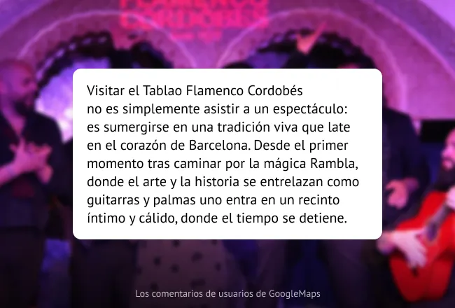 Desde 1970, Grupo Cordobes mantiene viva la llama del flamenco en el corazón de Barcelona. Fundado por una familia de artistas, lleva más de medio siglo ofreciendo una experiencia que va mucho más allá del espectáculo: una celebración de la tradición, la emoción y el talento. Hoy, su legado late con fuerza en dos espacios únicos: el Tablao Flamenco Cordobes, en plena Rambla, y El Duende, su nuevo escenario íntimo, creado para sentir el arte a pocos metros del alma que lo interpreta.