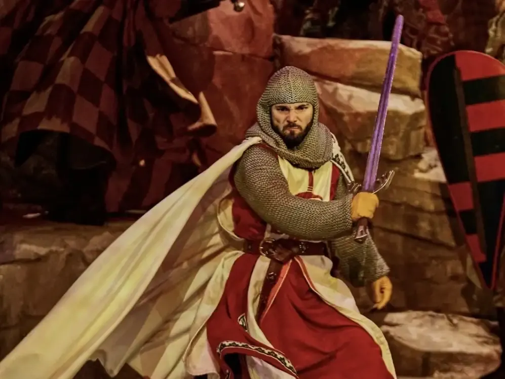 En un terreno de 30 hectáreas conviven barrios medievales, talleres artesanales y grandes espacios escénicos. Las representaciones diurnas recorren distintas épocas y personajes de la historia de España, desde El Cid hasta Colón, reuniendo en un mismo escenario a cientos de actores, jinetes y artistas con