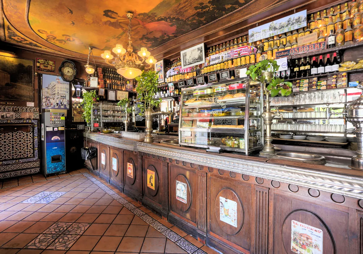 En el interior, todo el concepto no ha cambiado un siglo después. Hay dos zonas separadas: la barra original de madera tallada y hojalata y el antiguo almacén con mesas bajas. Las paredes están decoradas con hermosos azulejos originales, ocho antiguas cubas de roble y botellas de época. Además, en sus techos se pueden ver murales antiguos que representan el paso del tiempo. Muchos han visto la taberna en la película de Almodóvar de 1955, «La flor de mi secreto».